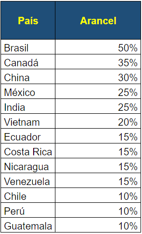 Entre los aranceles que Estados Unidos impondrá a los países competidores de Colombia a partir del 7 de agosto, se encuentran: